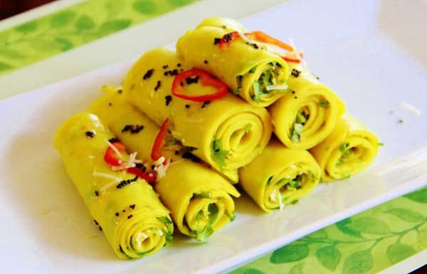 One of the much-loved Gujarati snacks, khandvi is also known as Patuli or Dahivadiand made with gram flour. Khandvi is also a popular snack in Maharashtrian cuisine. This rolled, bright snack is tempered with coconut, mustard seeds and curry leaves aand is a delight to serve with tea.